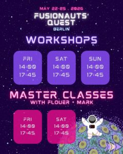 Masterclasses: Next to their regular workshops, Fusionauts’ Quest is collaborating with Flouer & Mark to offer masterclasses for advanced Fusion dancers. It’s a chance to dive extra deep with dancers pre selected through audition process. Workshop days can be booked separately.